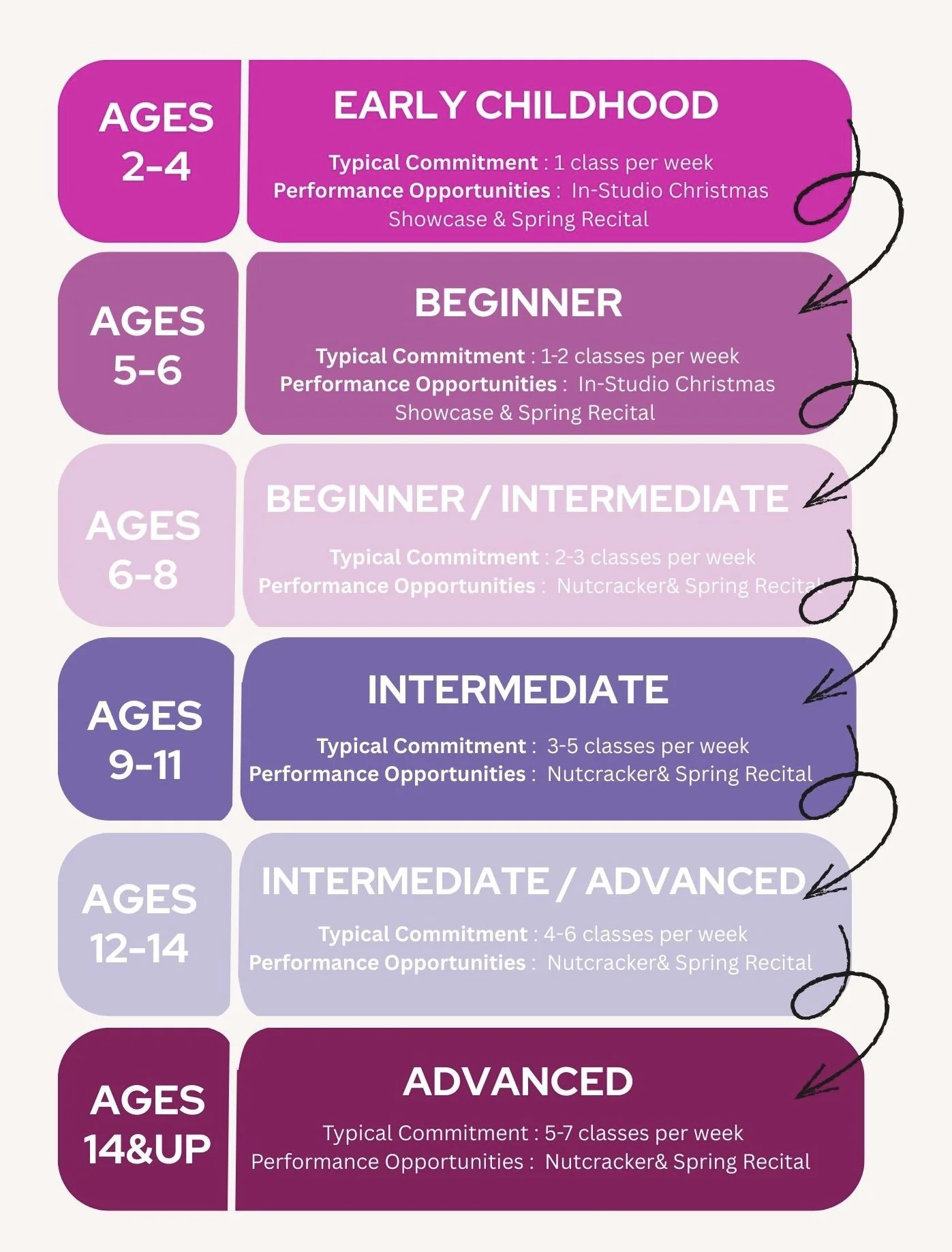 Dancers learn to express themselves with confidence, artistry and authenticity and are given opportunities to bring stories to life through movement and performance.