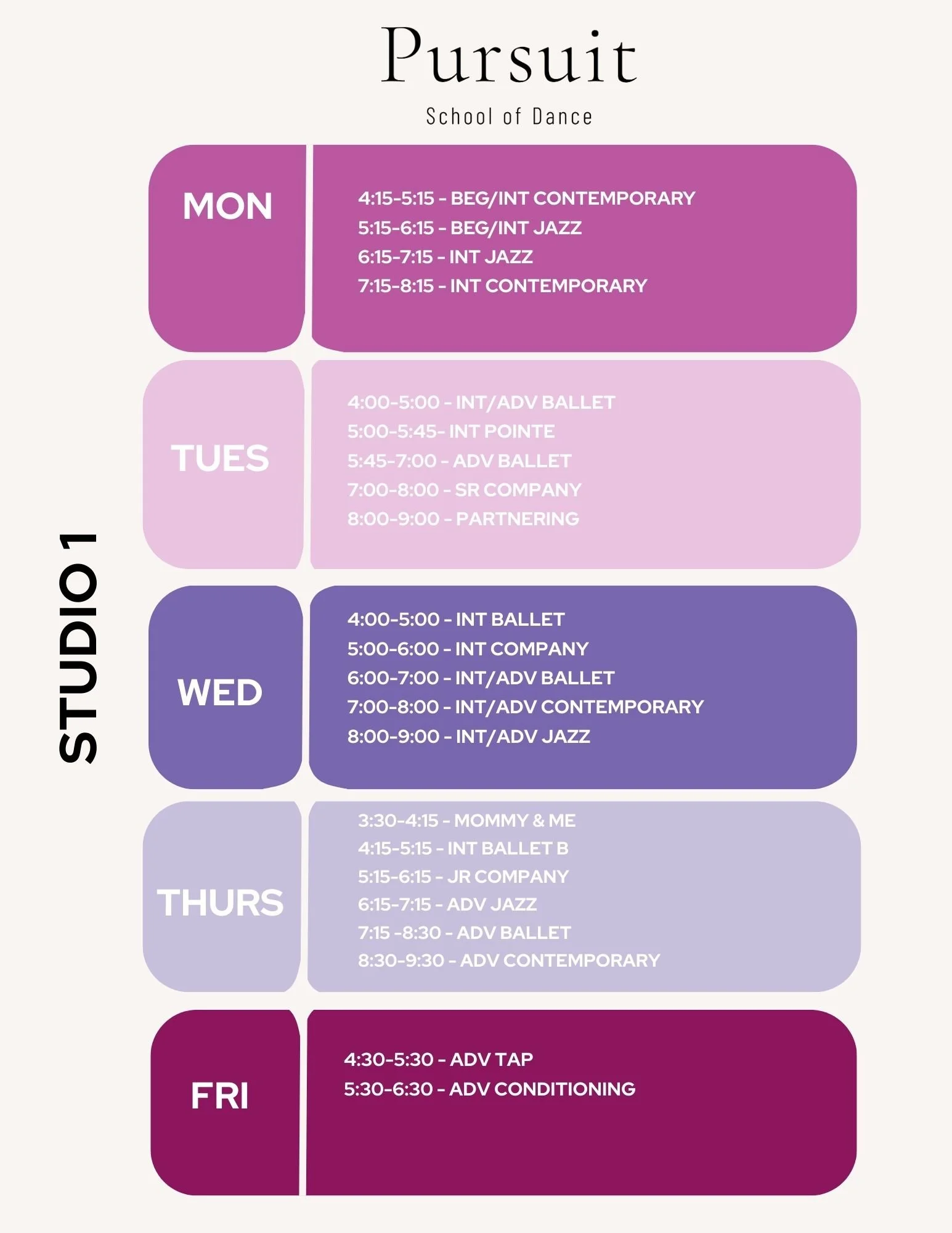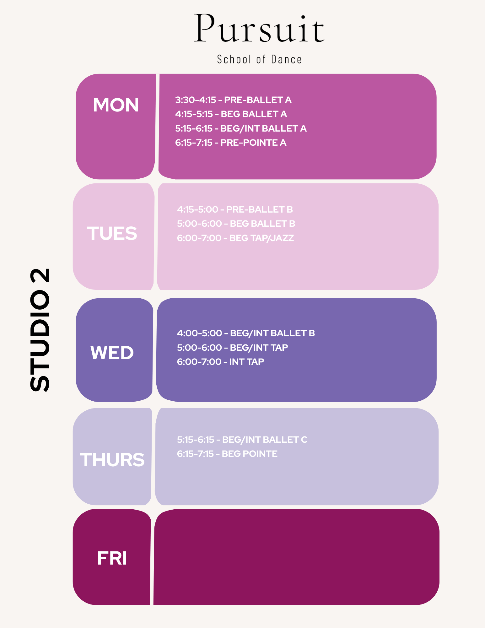 At Pursuit School of Dance, dancers progress through a structured training pathway designed to support technical development, artistry, and performance opportunities.